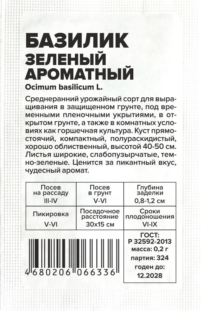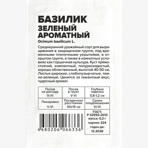 Среднеранний урожайный сорт для выращивания в защищенном грунте, под временными пленочными укрытиями, в открытом грунте, а также в комнатных условиях как горшечная культура. Куст прямостоячий, компактный, полураскидистый, хорошо облиственный, высотой 40-50 см. Листья широкие, слабопузырчатые, темно-зеленые. Ценится за пикантный вкус, чудесный аромат. Базилик богат витаминами, минеральными веществами, обладает тонизирующими свойствами, улучшает пищеварение. Свежие и сухие листья базилика применяют как приправу в кулинарии, а также при засолке и консервировании. Место посадки: солнечные участки с легкой рыхлой почвой. Хорошие предшественники лук, томаты и другие корнеплоды Освещение: обильное, плохо переносит затенение Предпосевная подготовка: не проводится Сроки посева: первый посев проводят при прогревании почвы до +10°С (апрель-июль), в течении теплого периода можно проводить повторные посевы. Для получения ранней зелени можно выращивать через рассаду, а также в качестве комнатной культуры Посев на рассаду: семена раскладывают на уплотненный и предварительно увлажненный грунт, заделывают на глубину 0,5-0,7 см, обильно увлажняют теплой водой, накрывают пленкой до появления всходов. Важно не допустить пересыхания грунта Посев в грунт: семена раскладывают в уплотненные бороздки глубиной 0,5-0,7 см, расстояние между рядками не менее 15 см, присыпают грунтом, уплотняют, накрывают тонким укрывным материалом и очень обильно поливают теплой водой через укрывной материал (во избежание размывания почвы и семян). Не допускают пересыхания посевов, укрывной материал снимают при появлении 70% всходов Пикировка/перевалка: при рассадном выращивании высаживают в открытый грунт или теплицу при миновании угрозы возвратных заморозков. После высадки притеняют 5-7 дней Уход: хорошо отзывается на срезание зеленой массы на уровне грунта для повторного отрастания
