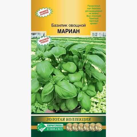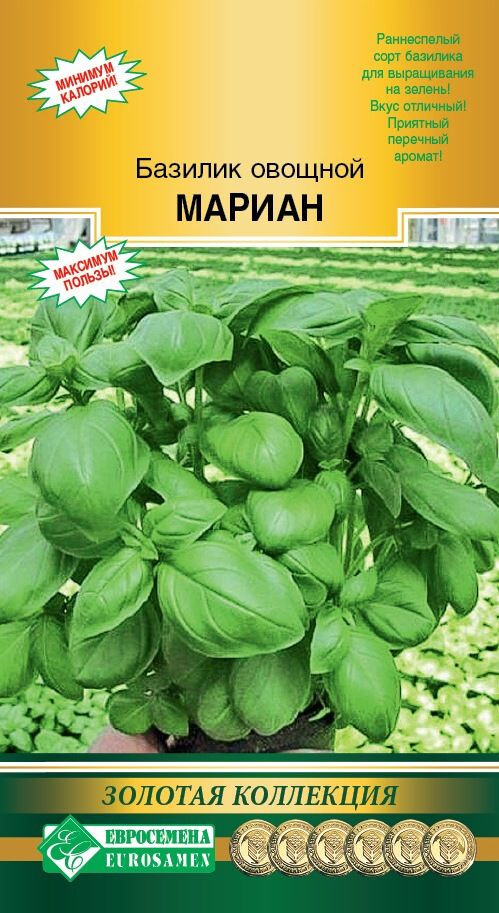 Базилик – настоящая находка для любого огородника, который ищет полезную, красивую и одновременно неприхотливую в выращивании пряность. Базилик красивый, душистый и вкусный. При посадке растения в июне и даже начале июля уже через 2 месяца собирают богатый урожай. Используется в свежем виде как салатная зелень и пряно-вкусовая добавка в домашней кулинарии и при консервировании. Базилик улучшает пищеварение, возбуждает аппетит, обладает противовоспалительным действием, широко применяется в медицине при простудных заболеваниях верхних дыхательных путей. Мариан- раннеспелый сорт зеленого базилика. От всходов до потребления 40-50 дней. Растение с тёмно - зелёными листьями среднего размера без антоциановой окраски. Вкус листьев отличный, нежный, с приятным перечным ароматом. Масса одного растения до 250 г. Сорт устойчив к краевому ожогу листьев. Отличается устойчивостью к пониженным температурам. Плотность посадки 15-20 растений/м². Урожайность зелени 2,5-3,2 кг/м².