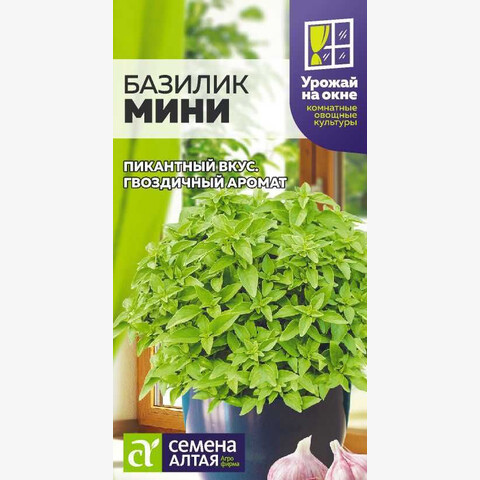 Среднеранний (50-60 дней) сорт карликового базилика идеально подходит для выращивания в комнатных условиях как горшечная культура, а также в открытом грунте. Куст компактный, декоративный, высотой до 30 см, с миниатюрными листочками. Листья и стебель зеленые с гвоздичным ароматом, сохраняющимся и в сушеном виде. Свежие листья обладают приятным пикантным вкусом, оказывают тонизирующее действие и улучшают пищеварение. Рекомендуется для использования в свежем и сушеном виде в качестве пряно-вкусовой добавки в различные салаты, горячие блюда и при консервировании. Хорошо растет на легком грунте с добавлением органики. Свето- и теплолюбив. При посеве в качестве горшечной культуры необходим дренаж. Оптимальный объем кашпо – 3-4 литра. Посев производят в феврале-апреле в рассадные емкости объемом 0,5 л. Семена размещают на слегка утрамбованный увлажненный грунт и присыпают слоем земли 0,8-1,2 см, опрыскивают теплой водой, накрывают пленкой и помещают в теплое место до появления всходов, важно не допустить подсыхания субстрата. При появлении всходов посевы раскрывают и помещают в теплое светлое место (t не ниже 20-25°C) без сквозняков. При недостатке естественного освещения во избежание вытягивания необходима досветка фитолампами. По мере роста корневой системы объем грунта постепенно увеличивают. Рассаду можно высадить в открытый грунт в конце мая – начале июня, разместить в кашпо на террасе или продолжить комнатное выращивание. Сбор урожая проводится по мере формирования зеленной массы.