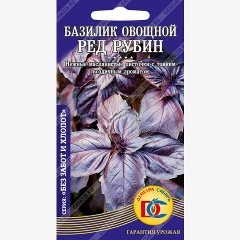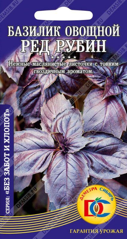 Никого не оставят равнодушным пряно-ароматное растение насыщенного фиолетового цвета, с тонким, дразнящим гвоздичным ароматом и нежными маслянистыми листочками. Растение средней высоты, прямостоячее. Период от полных всходов до начала цветения 65-70 дней. Масса одного растения 180-250 г. Базилик чувствителен к холоду, поэтому его лучше выращивать через рассаду или высевать в лунки под укрытие. Желательно прищипнуть для лучшего кущения. Он?прекрасно вырастет в квартире на солнечном окне. Отлично сочетается с блюдами из мяса, рыбы, морепродуктов, овощами и в особенности с томатами. Урожайность высокая.