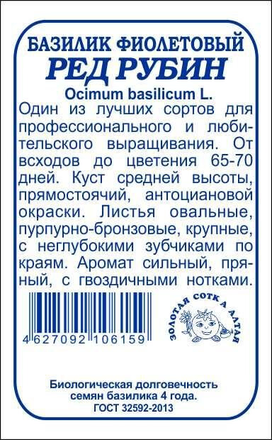 Среднеранний урожайный сорт фиолетового базилика. От всходов до начала хозяйственной годности 35-40 дней, до цветения 65-70 дней. Растение средней высоты. Листья фиолетово-красные, глянцевые, среднего размера, со слабой волнистостью и зубчатостью по краю. Цветы фиолетовые. Аромат сильный, с гвоздичными нотками. Используют в свежем и сушеном виде в качестве приправы, добавляют при консервировании.