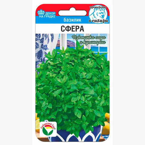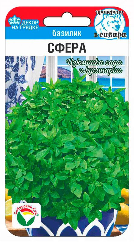 Ранеспелый (50-60 дней) сорт с высокодекоративной формой куста в виде сферы и насыщенным гвоздично-перечным ароматом! Благодаря своим декоративным качествам станет настоящей изюминкой клумб, балконов и вазонов, а также прекрасно дополнит кулинарные шедевры в свежем и сушёном виде. Растение компактное, обильно облиственное высотой 15-20см, хорошо сохраняет форму шара, очень декоративно. Листва ярко-зелёная, цветение обильное - вторая половина лета. В кулинарии используют цветы и листья растения, в свежем и сушеном виде. Веточка базилика придаст изысканные вкус зимним консервациям, домашним морсам и компотам. Для украшения блюд применяют срезанные стебли с листьями и цветами.