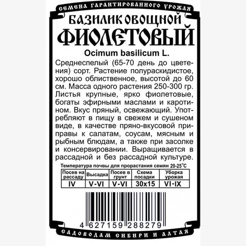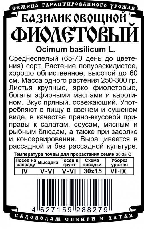 Среднеспелый (65-70 день до цветения) сорт. Растение полураскидистое, хорошо облиственное, высотой до 60 см. Масса одного растения 250-300 гр. Листья крупные, ярко фиолетовые, богаты эфирными маслами и каротином. Вкус пряный, освежающий. Употребляют в пищу в свежем и сушеном виде, в качестве пряно-вкусовой приправы к салатам, соусам, мясным и рыбным блюдам, а также при засолке и консервировании. Выращивается в рассадной и без рассадной культуре.