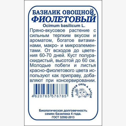 Однолетнее пряно-вкусовое растение, богатое эфирными маслами, витаминами, макро- и микроэлементами. От всходов до начала цветения 60-70 дней. Куст прямостоячий, полураскидистый, высотой до 60 см. Крупные листья и молодые побеги имеют насыщенную красно-фиолетовую окраску и обладают сильным терпким вкусом и ароматом. Используют в свежем и сушеном виде в качестве приправы, добавляют при консервировании.