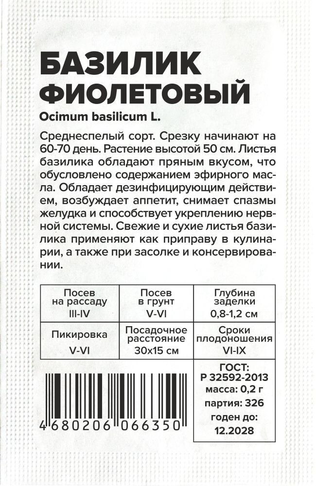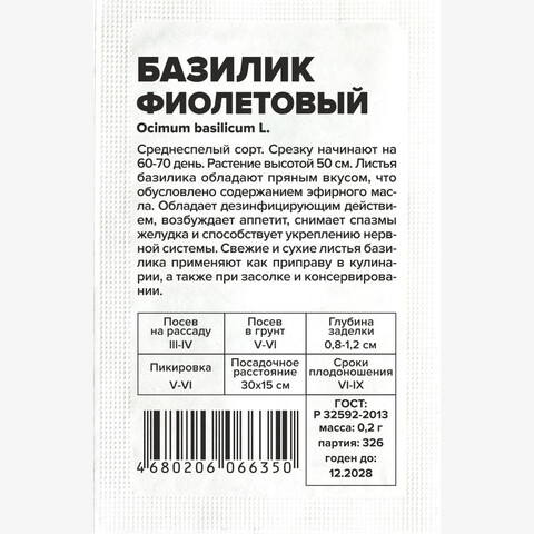 Среднеспелый сорт. Срезку начинают на 60-70 день. Растение высотой 50 см. Листья базилика обладают пряным вкусом, что обусловлено содержанием эфирного масла. Обладает дезинфицирующим действием, возбуждает аппетит, снимает спазмы желудка и способствует укреплению нервной системы. Свежие и сухие листья базилика применяют как приправу в кулинарии, а также при засолке и консервировании. Место посадки: солнечные участки с легкой рыхлой почвой. Хорошие предшественники лук, томаты и другие корнеплоды Освещение: обильное, плохо переносит затенение Предпосевная подготовка: не проводится Сроки посева: первый посев проводят при прогревании почвы до +10°С (апрель-июль), в течении теплого периода можно проводить повторные посевы. Для получения ранней зелени можно выращивать через рассаду, а также в качестве комнатной культуры Посев на рассаду: семена раскладывают на уплотненный и предварительно увлажненный грунт, заделывают на глубину 0,5-0,7 см, обильно увлажняют теплой водой, накрывают пленкой до появления всходов. Важно не допустить пересыхания грунта Посев в грунт: семена раскладывают в уплотненные бороздки глубиной 0,5-0,7 см, расстояние между рядками не менее 15 см, присыпают грунтом, уплотняют, накрывают тонким укрывным материалом и очень обильно поливают теплой водой через укрывной материал (во избежание размывания почвы и семян). Не допускают пересыхания посевов, укрывной материал снимают при появлении 70% всходов Пикировка/перевалка: при рассадном выращивании высаживают в открытый грунт или теплицу при миновании угрозы возвратных заморозков. После высадки притеняют 5-7 дней Уход: хорошо отзывается на срезание зеленой массы на уровне грунта для повторного отрастания