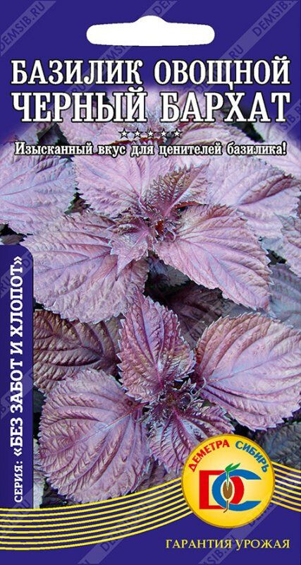 Среднеспелый (47-52 дня) сорт насыщенного фиолетового цвета, очень нежный и ароматный. Запах его тонкий, перечный. Растение ветвистое, средней высоты, хорошо облиственное, стебель фиолетового цвета. Листья крупные, яйцевидный, темно-фиолетовый с зубчатым краем, бархатно-нежные. Цветки розовые. Масса одного растения 250-300 г. Используется в свежем и сушеном виде в овощных и фруктовых салатах, как ароматическая приправа в кулинарии и в консервировании. Прекрасно растет в квартире на солнечном окне.