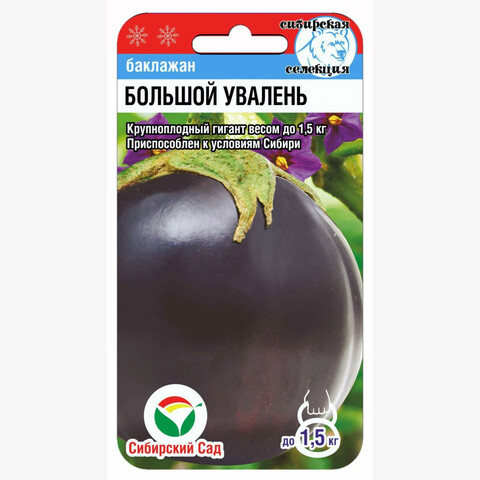 Сорт баклажана сибирской селекции с очень крупными плодами шаровидной формы. Зафиксирован плод-чемпион диаметром 20 см и весом 1850 грамм. Один такой гигант способен накормить вкусными блюдом целую семью. Сорт среднеранний, от всходов до технической спелости 120-130 дней. Приспособлен к условиям Сибири, выращивается в открытом грунте и пленочных укрытиях. Куст среднерослый, редкий, высотой 60-80 см. Плоды шаровидные, темно-фиолетовые, средней массой 700 г. Мякоть белая, плотная, очень вкусная, с малым количеством семян. Рекомендуется для домашней кулинарии и разного вида заготовок. Урожайность сорта до 7 кг/м2. В конце июля на растении оставляют 5-7 крупных завязей, остальные цветы и завязи удаляют.