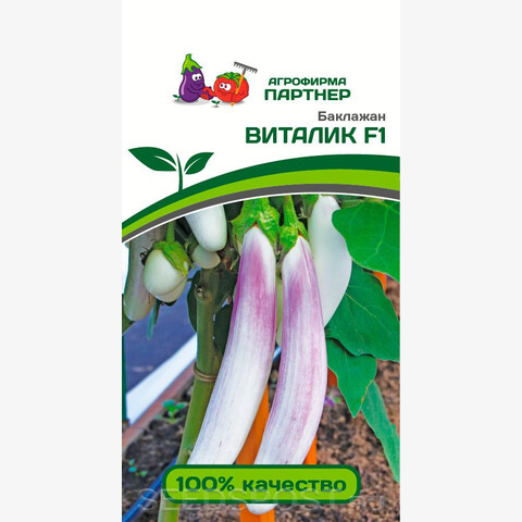 Партнер Баклажан ВИТАЛИК F1 Раннеспелый гибрид для открытого и защищенного грунта. Высота растения 70-90 см, урожай через 60-65 дней с момента высадки рассады. Длина баклажанов 25-30 см, диаметр серединной части около 7 см, масса плодов — 150-250 г. Гибрид отлично завязывает плоды в условиях длинного светового дня, устойчив к перепадам температур, вирусу табачной мозаики (TMV) и корневым гнилям. В упаковке 10 семян