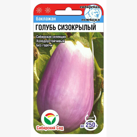 Высокоурожайный сорт сибирской селекции для открытого грунта и пленочных укрытий. Плоды с оригинальной сизо- сиреневой окраской, без горечи. Среднеранний, от всходов до плодоношения 107-115 дней. Хорошо плодоносит в открытом грунте вусловиях Сибири. Растение компактное, высотой до 50 см, формирует красивые грушевидные плоды длиной 15-20 см с белой плотной мякотью, массой до 250 грамм. Отличаются оригинальным лиловым цветом и отсутствием горечи. Средняя урожайность сорта - 2 кг плодов с растения. Рекомендуется для всех видов переработки. Посев на рассаду проводят в начале марта, пикировку - в фазе одного-двух настоящих листьев. Высадка рассады под пленочные укрытия - в середине мая, воткрытый грунт-в начале июня. Предпочитает рыхлые, питательные почвы, хорошо откликается наполиви внесение удобрений.