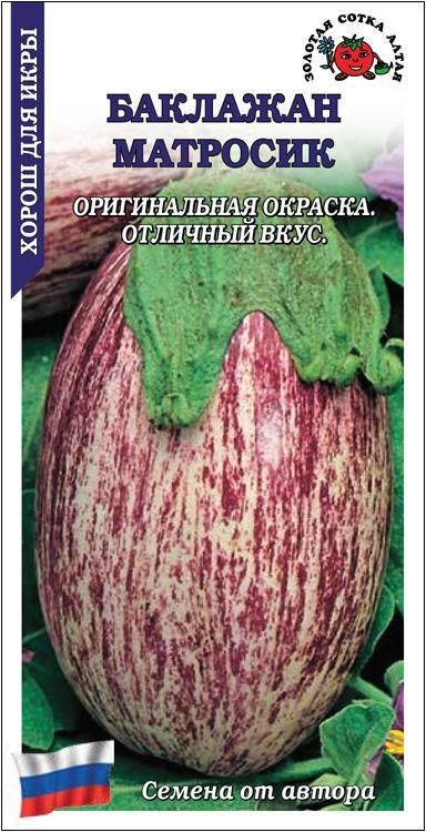 Высокоурожайный сорт длявыращивания в открытомгрунте и под пленочнымиукрытиями. Период от массовых всходов до начала технической спелости около 104дней. Растение полуштамбовое, полураскидистое. Плодыовальной формы, короткие,массой около 143 г, глянцевые, оригинальной полосатой сиренево-белой окраски. Мякоть белая, отличноговкуса, без горечи. Сорт рекомендуется дляиспользования в домашней кулинарии иприготовления икры.
