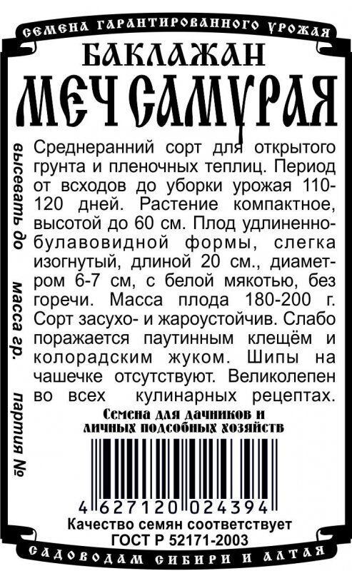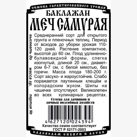 Среднеранний сорт для открытого грунта и пленочных теплиц. Период от всходов до уборки урожая 110-120 дней. Растение компактное, высотой до 60 см. Плод удлиненно-булавовидной формы, слегка изогнутый, длиной 20 см., диаметром 6-7 см, с белой мякотью, без горечи. Масса плода 180-200 г. Сорт засухо- и жароустойчив. Слабо поражается паутинным клещём и колорадским жуком. Шипы на чашечке отсутствуют. Великолепен во всех кулинарных рецептах.