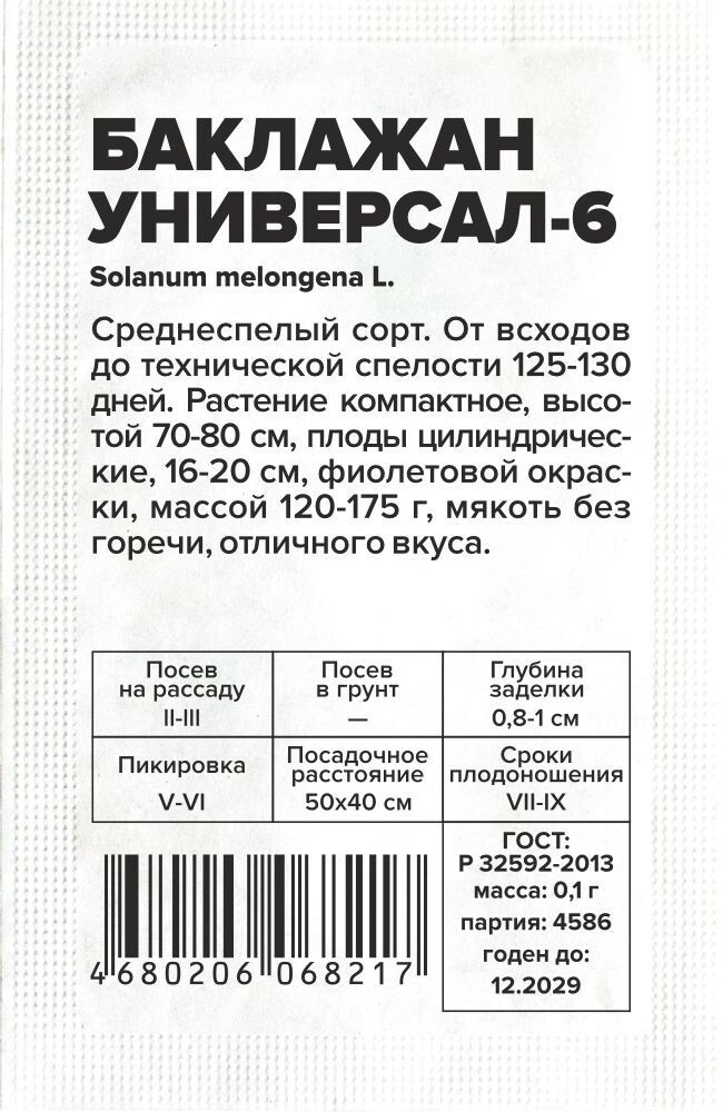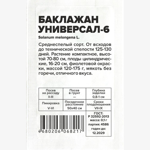 Среднеспелый сорт. От всходов до технической спелости 125-130 дней. Растение компактное, высотой 70-80 см, плоды цилиндрические, 16-20 см, фиолетовой окраски, массой 120-175 г, мякоть без горечи, отличного вкуса. Место посадки: предпочитает плодородные рыхлые нейтральные почвы Освещение: обильное, плохо переносит затенение Предпосевная подготовка: не нуждается в подготовке Сроки посева: за 75-80 дней до высадки (февраль-апрель) Посев на рассаду: семена раскладывают на выровненный и уплотненный теплый очень влажный грунт в рассадные ящики или индивидуальные емкости. Присыпают слоем почвы 0,8-1 см и хорошо уплотняют, аккуратно поливают теплой водой. Посевы накрывают прозрачной пленкой или стеклом. Оптимальная температура грунта для прорастания семян +25-27°С. При появлении первых петелек всходов укрытие снимают, при недостатке освещения обеспечивают досветку во избежание вытягивания рассады Посев в грунт: не предусмотрен Пикировка/перевалка: осуществляется в стадии 2-4 настоящих листьев, дальнейшие перевалки при необходимости по мере роста корневой системы в больший объем грунта Высадка в грунт: рассаду высаживают, когда минует угроза возвратных заморозков, почва прогреется до температуры +15°С (май-июнь), соблюдая схему посадки 50х40 см. Хорошо отзывается на внесение в почву органических удобрений (свежий навоз вносят с осени, перепревший весной) Уход: почва под растениями всегда должна оставаться увлажненной. После полива проводят рыхление вокруг растений. Подкормки проводят при наличии симптомов дефицитов питания. При выращивании в теплице необходимо обеспечивать проветривание