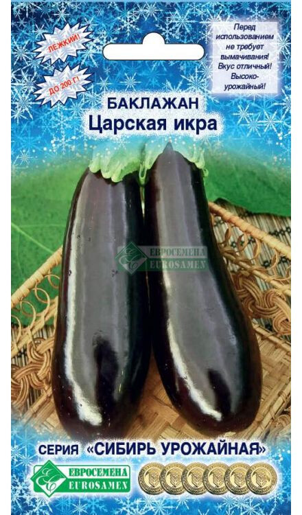 Баклажаны — излюбленный продукт многих хозяек. Они питательны, полезны, хороши для приготовления горячих блюд и маринования на зиму. Царская икра - раннеспелый сорт для выращивания в открытом грунте и под плёночными укрытиями в ЛПХ. Срок созревания 107-112 дней. Растение средне рослое, полу раскидистое. Стебель без антоциановой окраски, слабоопушенный. Листовая пластинка среднего размера, зелёная, гладкая, край ровный. Плод цилиндрический, слабоизогнутый, длинный, диаметр большой, в технической спелости тёмно-фиолетовый, сильно глянцевый. Шипы на чашечке отсутствуют или очень редкие. Мякоть беловатая, без горечи, перед использованием не требует вымачивания, отличного вкуса. Масса плода - 250 г. Урожайность товарных плодов под плёночными укрытиями - 8,4 кг/кв.м. Рекомендуется для выращивания во всех регионах России. Один из лучших сортов для приготовления икры. Пользу баклажана трудно переоценить, в нем содержится немало углеводов, белков, глюкозы, клетчатки, так необходимых человеческому организму.