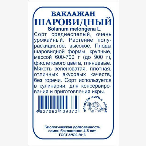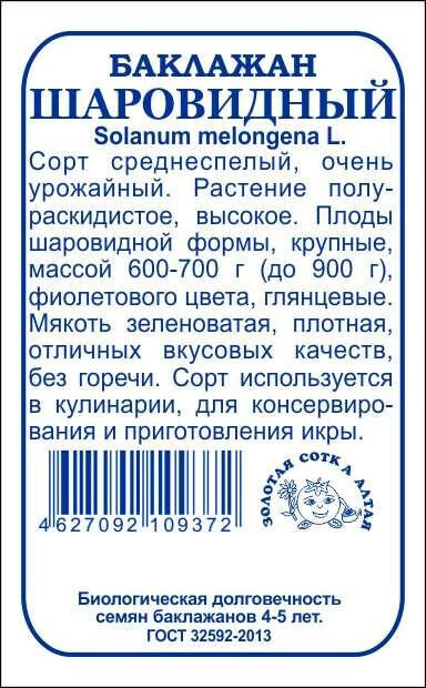 Сорт среднеспелый, очень урожайный. Растение полураскидистое, высокое. Плоды шаровидной формы, крупные, массой 600-700 г (до 900 г), фиолетового цвета, глянцевые. Мякоть зеленоватая, плотная, отличных вкусовых качеств, без горечи. Сорт используется в домашней кулинарии, в том числе для приготовления бутербродов и других горячих закусок, прекрасно подходит для различных зимних заготовок.