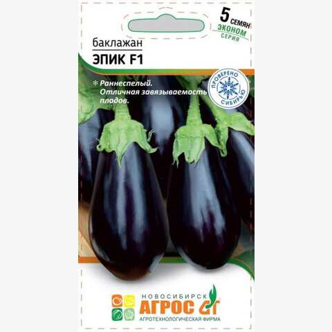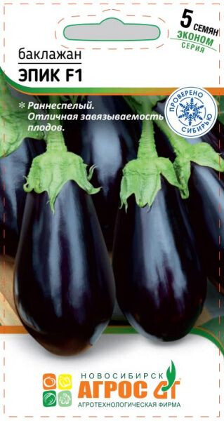 Раннеспелый гибрид, отличающийся хорошим завязыванием плодов. На компактном растении формируются крупные (10х22 см) темно-фиолетовые плоды отличного качества. Мякоть кремово-белая, плотная, без горечи. ЭПИК F1 хорош для приготовления блюд домашней кулинарии и переработки. Особенности выращивания: рекомендуется выращивать в открытом грунте или под временными пленочными укрытиями с обязательной подвязкой к вертикальной опоре. Рекомендуется выращивать рассаду без пикировки, что обеспечит более ранний сбор урожая. 90 II-III - V-VI 60x100 VII-IХ