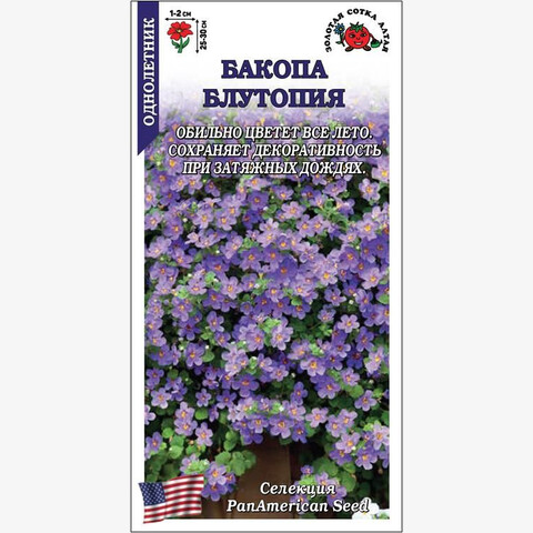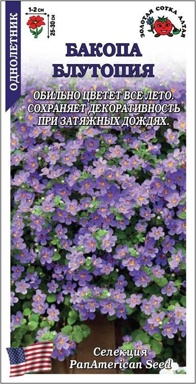 Бакопа – неприхотливое многолетнее растение, в условиях Сибири выращивается как однолетнее. Цветки одиночные пятилепестковые. Средний размер цветка до 2 см в диаметре. Форма соцветия – двугубые с короткой цветоножкой, формируются в пазухах листьев. Листья ланцетные, мелкие, цельные. Сутера ползучее растение, поэтому при выращивании на открытом грунте в каждом узле побега при контакте с грунтом образует корни. Бакопа предпочитает солнечные участки, при затенении побеги вытягиваются, цветение будет не таким обильным или может совсем прекратиться. Почва должна быть слабокислой. Торф и садовая земля в соотношении 1:1. Для формирования пышной формы рекомендуется прищипывать точки роста в молодом возрасте. Семена на рассаду высевают в марте-апреле. Посев поверхностный. Оптимальная температура для всходов 20-23°С и повышенная влажность. Всходы через 10-14 дней. Первая пикировка производится в стадии 1-2 настоящих листьев. Вторая с заглублением на один узел, чтобы бакопа устойчиво росла в субстрате. Бакопу можно выращивать как однолетнее почвопокровное растение, успешно задекорировать края небольшого водоема. Также бакопу подсаживают к штамбовым растениям. А для выращивания в вазонах и подвесных корзинах это одно из лучших растений. 20-25 III-IV - V-VI 20x20 VI-IX