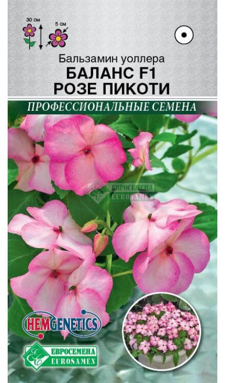 Impatiens walleriana Balance F1 Rose Picotee Бальзамины серии Баланс представлены в большом многообразии оттенков, это неприхотливое травянистое растение формирует компактный кустик, полностью усыпанный цветками, в благоприятных условиях - с хорошо разветвленным габитусом. Растения не вытягиваются во время пересадки, обладают компактными формами на протяжении всей вегетации. Крупные цветки имеют весьма эффектную окраску, множество которых как бы покрывают растения пушистой бело-розовой пеной. Цветки белые с нежно-розовым отливом, лепестки которых имеют четкую темно-розовую кайму по краям. Бальзамин великолепно сочетается с другими садовыми культурами. Успешно применяется в самых разных ландшафтных элементах – как в цветниках, так и в качестве бордюров, широко используется в контейнерных композициях. Ценится за высокие декоративные качества, неприхотливость, долгое и обильное цветение и универсальное назначение. Высокие показатели всхожести и сортовой чистоты!
