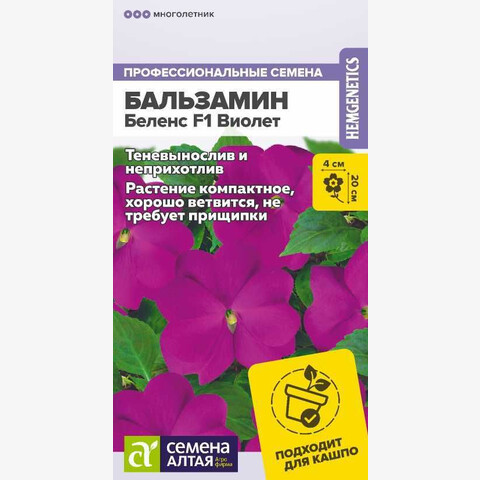 Компактное растение для тенистых участков. Хорошо ветвится и не вытягивается. Цветки крупные, насыщенной фиолетовой окраски. Цветение обильное, до заморозков. Подходит для комнатного выращивания, посадки в балконные ящики, а также для организации бордюрных посадок. В комнатных условиях можно выращивать в качестве многолетника Высота растения: 15-20 см Ширина растения: 20-25 см Диаметр цветка: 3-4 см Условия выращивания, место посадки: затененные места, полутень Требования к грунту: питательный легкий грунт (рекомендуется добавить вермикулит) с нейтральной или слабокислой реакцией Способы выращивания: рассадный Время посева на рассаду: февраль-март Способ посева: семена высевают на уплотненное ложе замоченных торфяных таблеток или увлажненного грунта, не заделывая, а слегка присыпая вермикулитом. Емкость накрывают прозрачной крышкой или пленкой до появления первых всходов, обеспечивают досветку 12-14 часов в сутки в течение первых двух недель от всходов, посевы периодически проветривают. Оптимальная температура для прорастания +22…24°С. Оптимальная температура для молодых растений +18…20°С. Время до появления всходов: 3-6 дней Перевалка: производится в стадии 2-4 настоящих листьев в рассадные емкости диаметром около 9 см, 4-5 неделя после появления всходов. Последующие перевалки осуществляются по мере роста корневой системы. Оптимальный диаметр конечной емкости – 15 см Время высадки в открытый грунт или кашпо: апрель-июнь, когда минует угроза возвратных заморозков (для открытого грунта), не ранее 5-6 недели от появления всходов Посадочное расстояние: 25-30 см Период цветения: апрель-сентябрь, в зависимости от сроков посева, около 10-12 недели от всходов Уход: рекомендуется полив чередовать с фазами подсушивания субстрата, но не допускать его переувлажнения и полного высыхания и увядания растений. Рыхление грунта проводят с осторожностью, чтобы не травмировать корневую систему. Первую подкормку проводят в начале бутонизации комплексным минеральным удобрением, далее – 1 раз в 2 недели. При необходимости применяют кальциевые подкормки. Во второй половине лета рекомендованы профилактические обработки против грибковых заболеваний