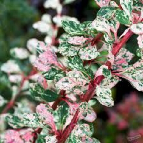 Листья барбариса Наташа имеют необычную окраску — они пурпурные с белыми краями, что создает эффект мраморности. Крона раскидистая. Уникальная окраска листьев. Смесь зеленого, белого и розового цветов. Листва сохраняет декоративность весь сезон.