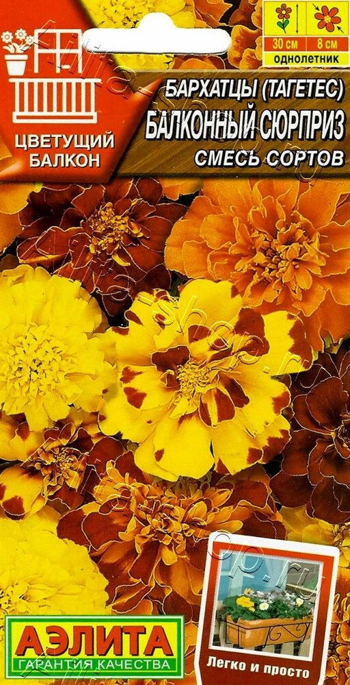 Специальная серия цветов для вашего балкона! Красочная смесь бархатцев американской селекции обеспечивает раннее цветение и превосходную декоративность в любую погоду. Растения формируют однородные кустики высотой* около 25-30 см. В период массового цветения они полностью покрываются яркими соцветиями* диаметром 5-8 см. Бархатцы великолепно украсят террасы и оконные контейнеры. В балконных ящиках расстояние между растениями не менее 10-15 см.