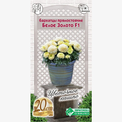 Бархатцы — любимые всеми цветы, которые дарят людям свою красоту и поднимают настроение яркими красками на протяжении всего лета. К тому же они неприхотливы. Родина их — американский континент. Бархатцами цветы назвали за нежные бархатистые лепестки. Другое название цветка Тагетес дано в честь бога Тагеса, который прославился своей красотой и способностью предвидеть. “Белое Золото -диплоидный карликовый гибрид прямостоячих бархатцев с крупным махровым цветком кремово-белого окраса, отличающийся неприхотливостью и компактным габитусом растения с отличным боковым ветвлением. Кустик разрастается в ширину до 20 см, роскошно и продолжительно цветет, не теряет своей привлекательности до осенних заморозков. Идеальный вариант для оформления клумб, рабаток, а самое главное, для посадок в кашпо, контейнеры и вазоны.