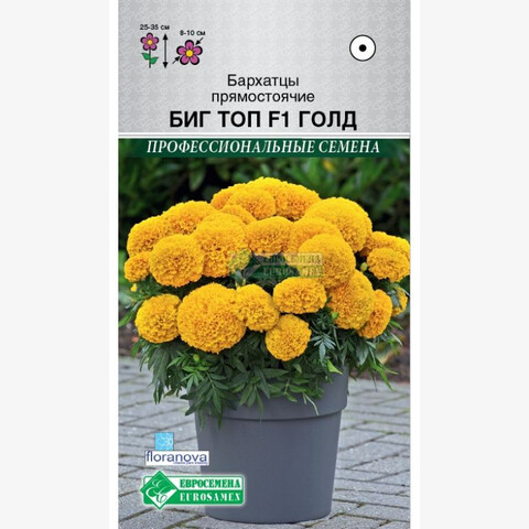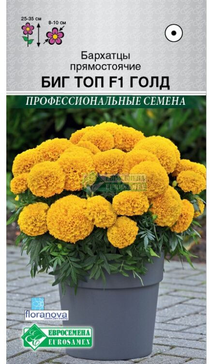 Бархатцы — любимые всеми цветы, которые дарят людям свою красоту и поднимают настроение яркими красками на протяжении всего лета. К тому же они неприхотливы. Родина их — американский континент. Бархатцами цветы назвали за нежные бархатистые лепестки. Другое название цветка Тагетес дано в честь бога Тагеса, который прославился своей красотой и способностью предвидеть. Биг Топ- новая серия прямостоячих бархатцев от английской компании Floranova, устойчивых к различным погодным условиям, с огромными густомахровыми соцветиями, сильными цветоносами и хорошо разветвленным габитусом растений. Гибрид отличается роскошным и продолжительным цветением, не теряет своей привлекательности до осенних заморозков. Идеальный вариант для оформления рабаток, различных клумб и цветников открытого грунта, а также для посадок в кашпо, контейнеры и вазоны.