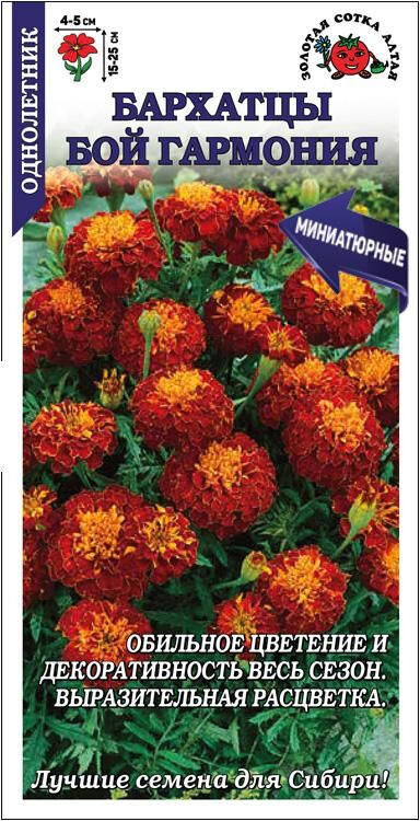 Серия миниатюрных бархатцев, способных обильно цвести и сохранять декоративность в течение всего сезона. Кустики компактные, пышные, с сильным ветвлением от основания. Соцветия гвоздиковидные, махровые, выразительной двухцветной окраски: темно-красный воротничок обрамляет оранжево-желтую серединку. Низкорослые бархатцы используются для оформления клумб, бордюров и рабаток, высаживаются в различные контейнеры.
