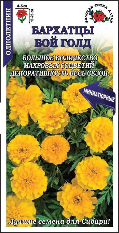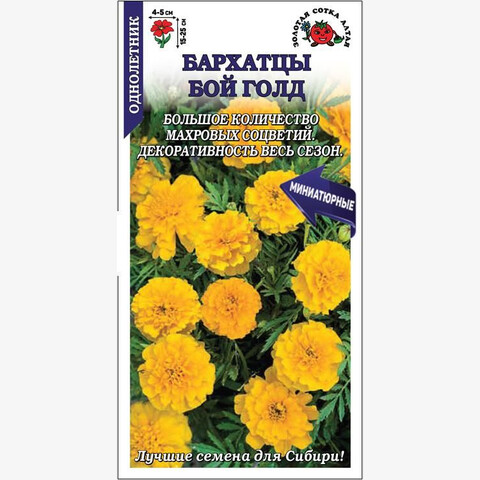 Серия миниатюрных бархатцев, способных обильно цвести и сохранять декоративность в течение всего сезона до осенних заморозков. Кустики компактные, пышные, великолепно ветвятся от основания и образуют большое количество насыщено-желтых махровых соцветий гвоздиковидной формы. Низкорослые бархатцы используются для обсадки цветников, оформления клумб, бордюров и рабаток, высаживаются в ящики, горшки и вазоны.