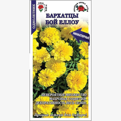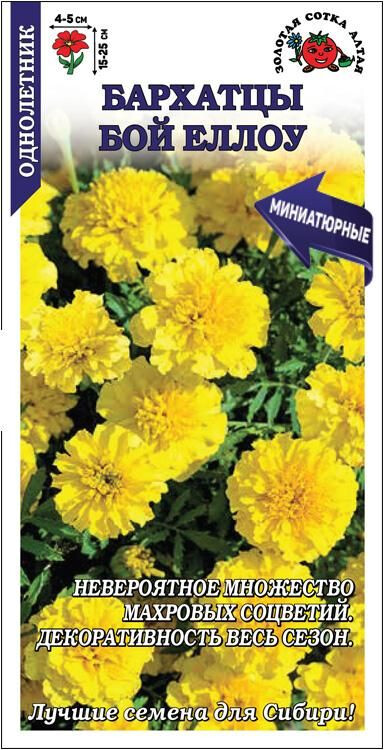 Серия миниатюрных бархатцев, способных обильно цвести и сохранять декоративность в течение всего сезона до осенних заморозков. Растения компактные, пышные, великолепно ветвятся от основания и образуют невероятное множество светло-желтых махровых соцветий гвоздиковидной формы. Низкорослые бархатцы используются для обсадки цветников, оформления клумб, бордюров и рабаток, высаживаются в ящики, горшки и вазоны.