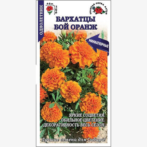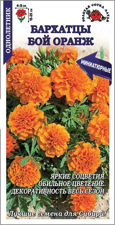 Серия миниатюрных бархатцев, способных обильно цвести и сохранять декоративность на протяжении всего сезона до осенних холодов. Кустики компактные, пышные, с сильным ветвлением от основания. Соцветия многочисленные, гвоздиковидные, махровые, яркой и насыщенной оранжевой окраски. Низкорослые бархатцы используются для обсадки цветников, оформления клумб, бордюров и рабаток, высаживаются в ящики, горшки и вазоны.