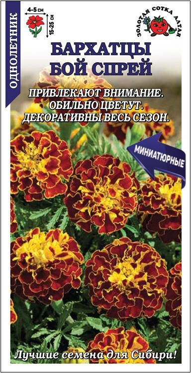 Серия миниатюрных бархатцев, способных обильно цвести и сохранять декоративность в течение всего сезона. Растения компактные, пышные, с сильным ветвлением от основания. Соцветия гвоздиковидные, махровые, привлекающей внимание окраски: махагонового цвета воротничок обрамляет ярко-желтую серединку. Низкорослые бархатцы используются для оформления клумб, бордюров и рабаток, высаживаются в различные контейнеры.