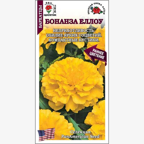Популярная и востребованная серия отклоненных бархатцев. Кустики компактные, шириной 15-20 см, с крепкими цветоносами. Соцветия крупные, густомахровые, яркого желтого цвета. Бархатцы серии Бонанза отличаются ранним цветением, идеальной выравненностью по габитусу, неприхотливостью к условиям выращивания и обилием цветков. Используются в различных цветниках и группами на газоне, высаживаются в контейнеры.