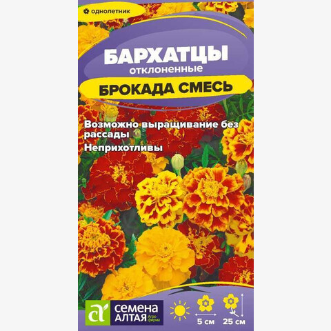 Очаровательная смесь низкорослых бархатцев высотой до 25 см. Компактные густо облиственные кустики покрыты махровыми соцветиями ярких окрасок. Диаметр корзинок 4-5 см, в центре небольшой хохолок из трубчатых цветков. Является отличным украшением парадных цветников, клумб, вазонов, балконных ящиков. Также выращивают среди посадок огородных растений для отпугивания вредителей. Неприхотливое, засухоустойчивое и светолюбивое растение, выносит небольшое затенение. Заморозков не переносит. Наибольшей декоративности достигает на открытых солнечных участках с питательными нейтральными суглинистыми почвами. Посев семян на рассаду проводят в марте. Глубина заделки семян 0,5 см. Посевы накрывают черной плёнкой для поддержания необходимого уровня влажности. При температуре +20-22°С всходы появляются через 7-10 дней, пленку убирают, температуру понижают до +16-18°С, во избежание вытягивания рассады. В грунт высаживают, когда минует угроза заморозков. Схема посадки 20х30 см. Цветение – через 2-2,5 месяца от посева, с июня до заморозков. В районах с мягким климатом возможен посев семян в открытый грунт в мае на глубину 1,0-1,5 см.