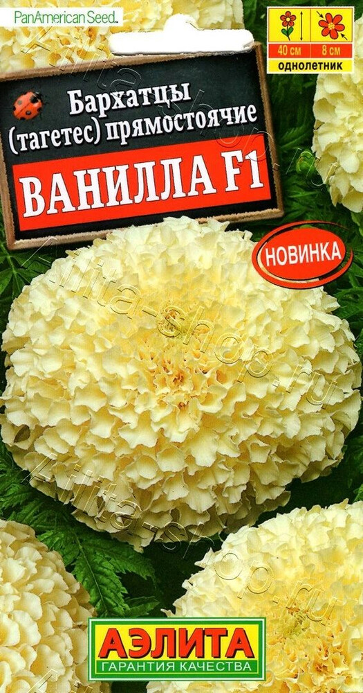 Потрясающий однолетник с крупными цветками настоящего кремового оттенка. Гибрид формирует прямостоячий куст высотой до 40 см и шириной до 25 см. Цветы крупные, густомахровые, ? 6-8 см. Листья насыщенного темно-зеленого цвета. Растение неприхотливое и при правильном уходе порадует цветением до самых заморозков. Бархатцы используют для создания пышных бордюров, рабаток, прекрасно подходят для балконных контейнеров и горшков. Дают отличную срезку. Бархатцы предпочитают солнечные участки с дренированными, плодородными почвами нейтральной кислотности. Растения теплолюбивые, быстрорастущие, взрослые – достаточно засухоустойчивые.