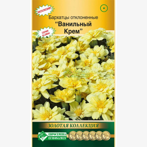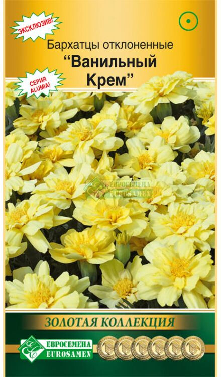 Эксклюзивный сорт, летник премиум-класса. Уникальный цвет бархатцев выделяет их из множества привычных сортов. Нежные ванильно-кремовые цветки смотрятся необычайно свежо. Сорт ультраранний, зацветает в рассаде. Хорошо ветвящийся от основания кустик стойко переносит непогоду, не разваливаясь от порывов ветра, сильных дождей. Прекрасно растет в балконных и садовых контейнерах. В открытом грунте растения хороши в бордюрах, массивами на рабатках, по переднему краю сборных цветников.