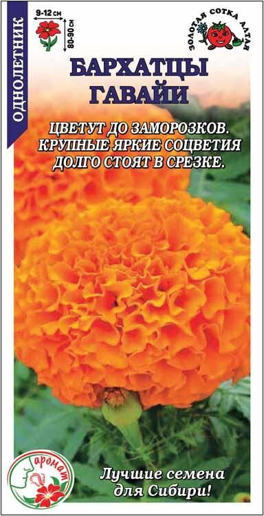 Величественное растение с прочными светло-зелеными побегами. Соцветия густомахровые, гвоздиковидные, крупные, насыщенного оранжевого цвета. Сорт цветет с июля по октябрь. Используется для оформления заднего плана цветников, создания бордюра, посадки на клумбы и рабатки. Срезанные цветы долго стоят в воде. Бархатцы отпугивают вредителей, обеззараживают почву, а их аромат способен успокаивать и снимать стресс.