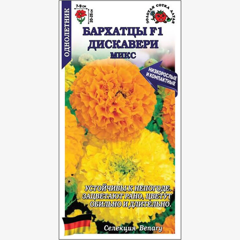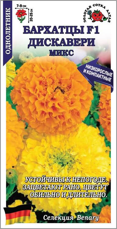 Гибриды Discovery одни из самых низкорослых среди прямостоячих бархатцев. Кустики исключительно компактные, пышные, выдерживают и дождь, и ветер. Соцветия крупные, густомахровые, насыщенных расцветок. Серия идеальна для контейнерного выращивания, используется для создания цветников, высаживается вдоль дорожек. Зацветает в июне (при выращивании рассады) и сохраняет обильность цветения на протяжении всего сезона.