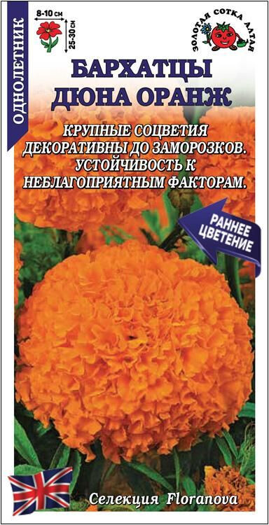 Уникальная раннецветущая серия, устойчивая к неблагоприятным факторам. Растения прекрасно держат форму и до самых заморозков сохраняют декоративный вид. Соцветия насыщенной оранжевой окраски, приплюснутые, густомахровые, плотные, с гофрированными краями. Низкорослые бархатцы широко применяются в ландшафтном озеленении и высаживаются в различные контейнеры.