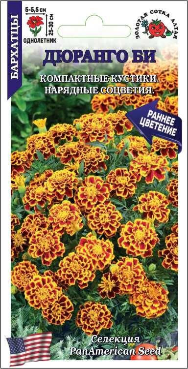 Великолепная серия низкорослых анемоновидных бархатцев. Компактные, хорошо ветвящиеся от основания кустики выравнены по высоте и времени цветения. Соцветия многочисленные, махровые, яркой двухцветной окраски. Серия Дюранго отличается очень ранним и обильным цветением, прекрасно подходит для ландшафтного озеленения и посадки в различные контейнеры.