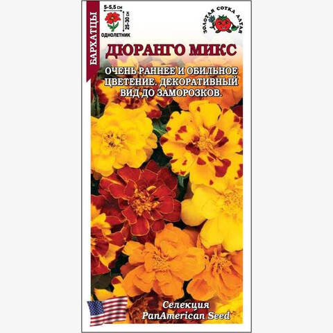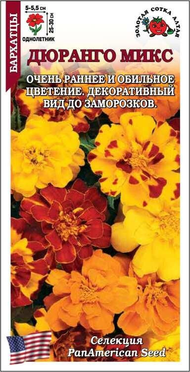 Великолепная серия низкорослых бархатцев для ландшафтного озеленения и посадки в различные контейнеры. Растения компактные, хорошо ветвятся, выравнены по высоте и времени цветения, образуют множество махровых анемоновидных соцветий. Бархатцы серии Дюранго зацветают рано и цветут очень обильно в течение всего сезона, сохраняя декоративный вид до заморозков.