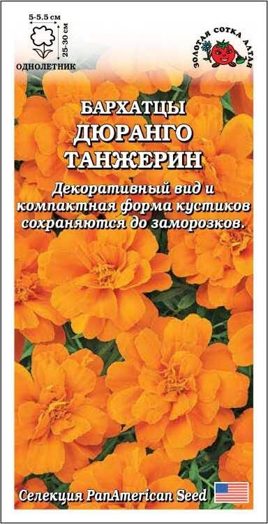 Бархатцы серии Дюранго зацветают рано и пышно цветут в течение всего сезона, сохраняя декоративный вид до заморозков. Растения компактные, ветвистые, выравнены по высоте и времени цветения, образуют множество махровых анемоновидных соцветий сочного мандаринового цвета. Великолепно подходят для ландшафтного озеленения и посадки в различные контейнеры.