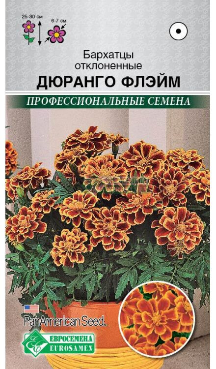 Бархатцы отклоненные (или французские) занимают лидирующие позиции по популярности среди садоводов. Они культивируются по всему миру, используются в декоративном садоводстве, кулинарии, косметической промышленности и медицине. Их популярность обусловлена красотой соцветий, неприхотливостью и простотой выращивания, это наиболее часто встречающийся летник на дачных участках и в ландшафтных композициях. Дюранго- серия анемоновидных бархатцев с ранним обильным цветением, крепкими цветоносами, крупными цветками с сочной, насыщенной окраской и прекрасным ветвлением боковых побегов. Растения образуют компактные кустики, выровненные по высоте и времени цветения, хорошо переносят пересадку в цветущем состоянии, имеют высокую устойчивость к не погодным условиям. Прекрасно смотрятся в бордюрах, цветниках и рабатках, хорошо сочетаются с флоксами, георгинами, астрами, геранью, могут являться основой любого цветника или клумбы.