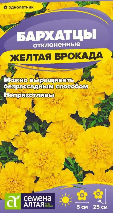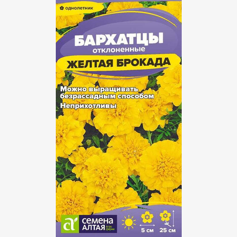 Декоративный однолетник высотой 20-25 см. Кустики компактные густооблиственные. Соцветия-корзинки идеальной формы гвоздиковидные ярко-желтые. Диаметр корзинок 4-5 см, в центре небольшой хохолок из трубчатых цветков. Послужит отличным украшением парадных цветников, клумб, балконов, можно выращивать среди огородных растений для отпугивания вредителей. Неприхотливое, засухоустойчивое и светолюбивое растение, выносит небольшое затенение. Заморозков не переносит. Наибольшей декоративности достигает на открытых солнечных участках с питательными нейтральными суглинистыми почвами. Посев семян на рассаду проводят в марте. Глубина заделки семян 0,5 см. Посевы накрывают черной плёнкой для поддержания необходимого уровня влажности. При температуре +20-22°С всходы появляются через 7-10 дней, пленку убирают, температуру понижают до +16-18°С, во избежание вытягивания рассады. В грунт высаживают, когда минует угроза заморозков. Схема посадки 20х30 см. Цветение – через 2-2,5 месяца от посева, с июня до заморозков. В районах с мягким климатом возможен посев семян в открытый грунт в мае на глубину 1,0-1,5 см.