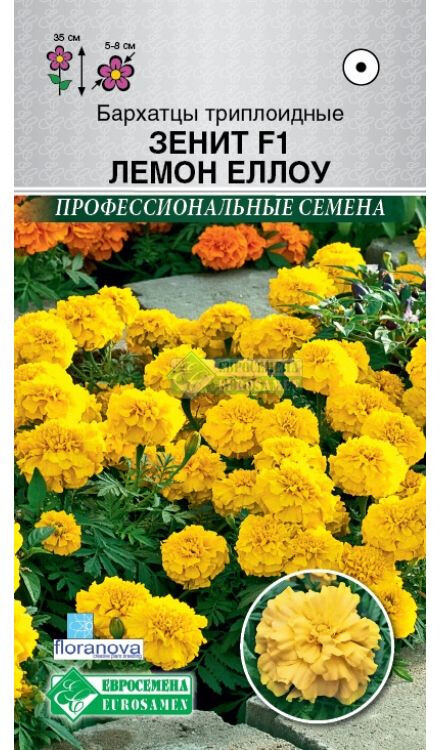 Бархатцы — любимые всеми цветы, которые дарят людям свою красоту и поднимают настроение яркими красками на протяжении всего лета. К тому же они неприхотливы. Родина их — американский континент. Бархатцами цветы назвали за нежные бархатистые лепестки. Другое название цветка Тагетес дано в честь бога Тагеса, который прославился своей красотой и способностью предвидеть. Триплоидные бархатцы “Зенит - уникальная серия межвидовых гибридов, полученная путем скрещивания отклоненных и прямостоячих бархатцев, сочетающих в себе целый ряд улучшенных характеристик: хорошее ветвление, обильное цветение, устойчивость к жаре, прекрасное восстановление после непогоды. Их прелесть в том, что они объединяют в себе размер цветка прямостоячих бархатцев-шапок и многообразие расцветок французских махровых бархатцев. Очень интересное и необычное сочетание. Идеальный вариант карликовых бархатцев для оформления клумб, рабаток, а самое главное, для посадок в кашпо, контейнеры и вазоны.