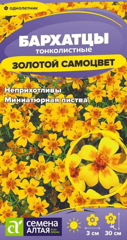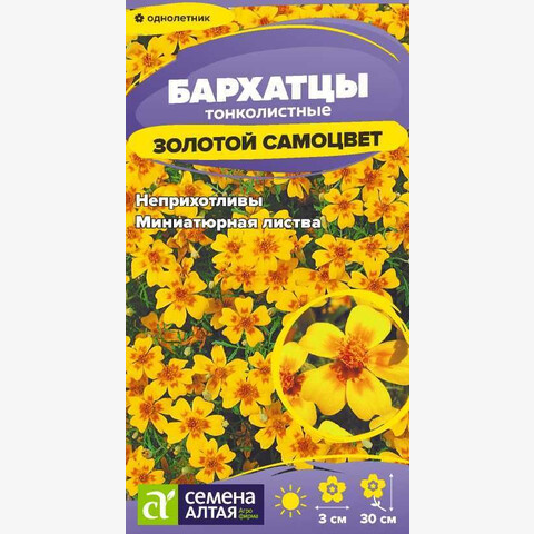 Обильноцветущие яркие тонколистные бархатцы. Растение сильноветвистое, формирует раскидистый кустик правильной куполовидной формы с множеством тонких побегов и изящными перисто-рассеченными листьями, в период цветения усыпанный золотисто-желтыми простыми соцветиями-корзинками до 3 см в диаметре. В пору цветения растение похоже на цветущий шар. Бархатцы используют во всех типах цветников. Они великолепно заполняют промежутки между соседними растениями, а также украшают террасы, балконы и вазоны, хороши для создания бордюров, рабаток и клумб, великолепно смотрятся у подпорных стенок, кулис кустарников. Неприхотливое, засухоустойчивое и светолюбивое растение, выносит небольшое затенение. Заморозков не переносит. Наибольшей декоративности достигает на открытых солнечных участках с питательными нейтральными суглинистыми почвами. Посев семян на рассаду проводят в марте. Глубина заделки семян 0,5 см. Посевы накрывают черной плёнкой для поддержания необходимого уровня влажности. При температуре +20-22°С всходы появляются через 7-10 дней, пленку убирают, температуру понижают до +16-18°С, во избежание вытягивания рассады. В грунт высаживают, когда минует угроза заморозков. Схема посадки 20х30 см. Цветение – через 2-2,5 месяца от посева, с июня до заморозков. В районах с мягким климатом возможен посев семян в открытый грунт в мае на глубину 1,0-1,5 см.