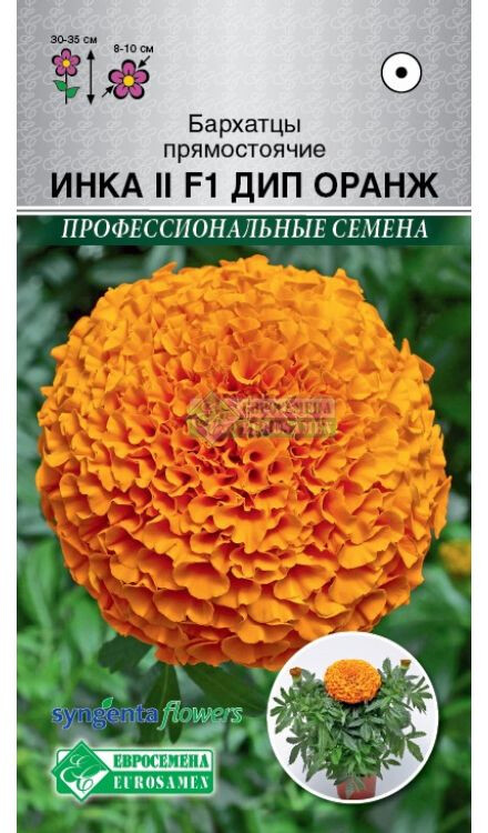 Бархатцы — любимые всеми цветы, которые дарят людям свою красоту и поднимают настроение яркими красками на протяжении всего лета. К тому же они неприхотливы. Родина их — американский континент. Бархатцами цветы назвали за нежные бархатистые лепестки. Другое название цветка Тагетес дано в честь бога Тагеса, который прославился своей красотой и способностью предвидеть. Инка II- среднерослые бархатцы, характеризующиеся ранним цветением и невысокой чувствительностью к длине дня. Растения хорошо разрастаются на клумбах и прекрасно развиваются даже в жарком климате. Огромные, густомахровые соцветия не теряют своей декоративности до осенних заморозков, это идеальный вариант для оформления рабаток, различных клумб и цветников открытого грунта, а также для посадок в горшки, контейнеры и вазоны. Прекрасный посевной материал с высокими показателями всхожести и сортовой чистоты.