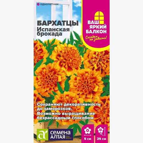Яркий декоративный однолетник. Образует компактный густооблиственный кустик высотой до 25 см. Соцветия гвоздиковидные идеальной формы, оранжево-красные с широкой ярко-желтой каймой по краю лепестков. Диаметр корзинок 4-5 см, в центре небольшой хохолок из трубчатых цветков. Послужит отличным украшением парадных цветников, клумб, вазонов, балконных ящиков. Также выращивают среди посадок огородных растений для отпугивания вредителей. Неприхотливое, засухоустойчивое и светолюбивое растение, выносит небольшое затенение. Заморозков не переносит. Наибольшей декоративности достигает на открытых солнечных участках с питательными нейтральными суглинистыми почвами. Посев семян на рассаду проводят в марте. Глубина заделки семян 0,5 см. Посевы накрывают черной плёнкой для поддержания необходимого уровня влажности. При температуре +20-22°С всходы появляются через 7-10 дней, пленку убирают, температуру понижают до +16-18°С, во избежание вытягивания рассады. В грунт высаживают, когда минует угроза заморозков. Схема посадки 20х30 см. Цветение – через 2-2,5 месяца от посева, с июня до заморозков. В районах с мягким климатом возможен посев семян в открытый грунт в мае на глубину 1,0-1,5 см.