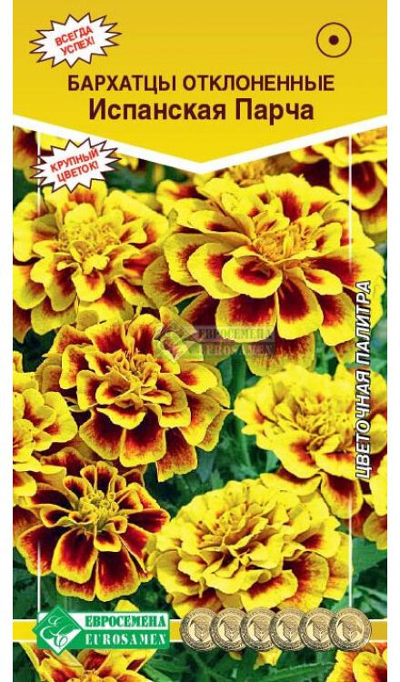 Бархатцы (латинское название Tagetes) – цветы солнца, символ долгой жизни во многих странах. Они заслуженно считаются одними из самых универсальных летников. Это и ландшафтная классика, и современная разновидность садовой флоры, обладающая внушительным набором достойных свойств. В настоящее время трудно себе представить, чтобы на садовом участке или даче не выращивались бы эти цветы. Сорт Испанская парча образует компактный густо облиственный кустик с соцветиями гвоздиковидной идеальной формы оранжево-красного цвета с широкой желтой каймой по краю. Обильно цветущий сорт до поздней осени – отличный вариант для бордюрных и обрамляющих посадок, рабаток и балконов, украшения вазонов и контейнеров, различных цветников открытого грунта. Высота растения-25 см Диаметр цветка-6-7 см