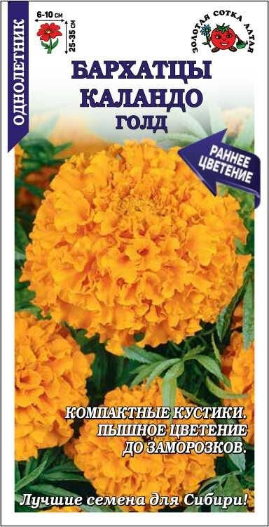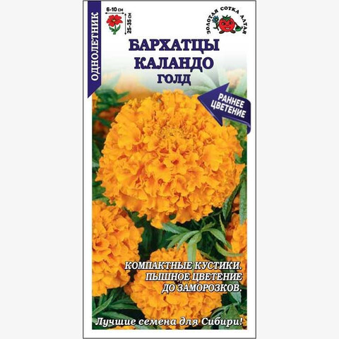 Бархатцы серии Каландо зацветают рано и очень обильно цветут до заморозков. Кустики компактной формой, ветвистые, шириной около 40 см. Соцветия насыщенно-желтые, пышные, густомахровые, придают особое очарование цветникам, прекрасно подходят для украшения окон и балконов. Бархатцы отпугивают вредителей и обеззараживают почву, их аромат способен успокаивать и снимать стресс.