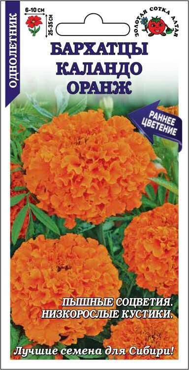 Бархатцы серии Каландо отличаются ранним и очень обильным цветением, компактной формой куста и огромными цветами. Растения сильноветвистые, шириной около 40 см. Соцветия ярко-оранжевые, пышные, густомахровые, придают особое очарование цветникам, прекрасно подходят для украшения окон и балконов. Бархатцы отпугивают вредителей и обеззараживают почву, их аромат способен успокаивать и снимать стресс.